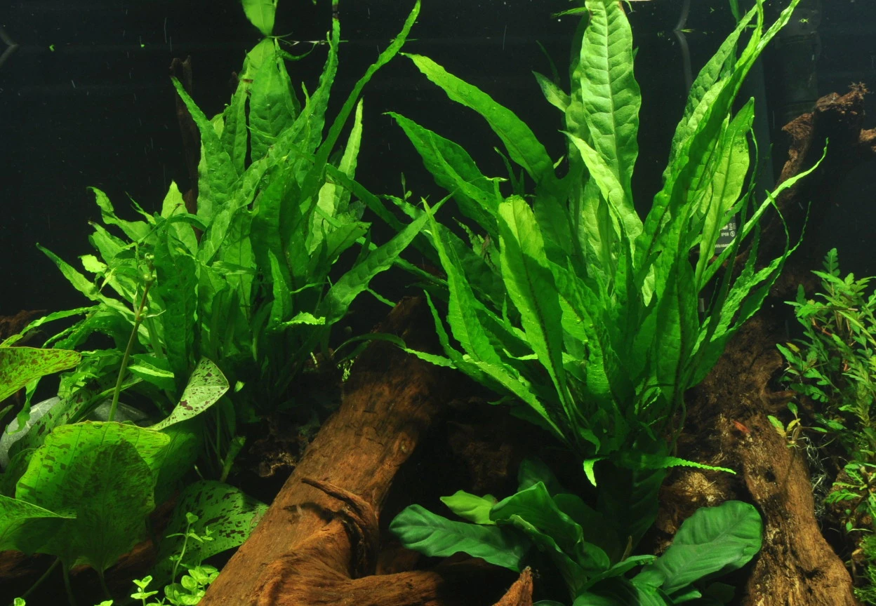 Das Javafarn auch Schwarzwurzel-Farn genannt ist ein sehr anspruchloses Wasserfarn, das mit wenig Licht sehr gut zurecht kommt und auf einer Wurzel oder einem Stein wachsen sollte. Bis es angewachsen ist sollte es mit einer Nylonschnurfixiert werden. Falls es in den Bodengrund gepflanzt wird, darf der Wurzelstock nicht bedeckt werden, da er sonst fault. Es lässt sich leicht durch Teilung des waagerechten Wurzelstocks (Rhizom) vermehren. Eine anspruchslose Pflanze, die unter allen Bedingungen wächst. Die schwarzen Flecken, die sich auf der Unterseite der Blätter bilden, sind Sporenbehälter (Vermehrungsorgane) und nicht wie manchmal vermutet eine Erkrankung. Adaptiv-Pflanzen bilden sich bei guter Pflege von selber an den Blattspitzen. Schöne Pflanze für Garnelen- als auch für Barschbecken.