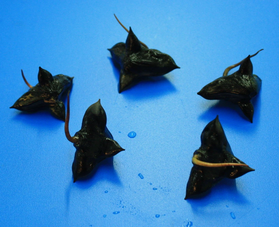 Sollte die Wassernuss als Pflanze einmal nicht lieferbar sein, behalten wir uns vor, Ihnen ausnahmsweise eine kräftige Nuss der Wassernuss (ohne Blätter) zu liefern. Siehe Bild 3 und 4.